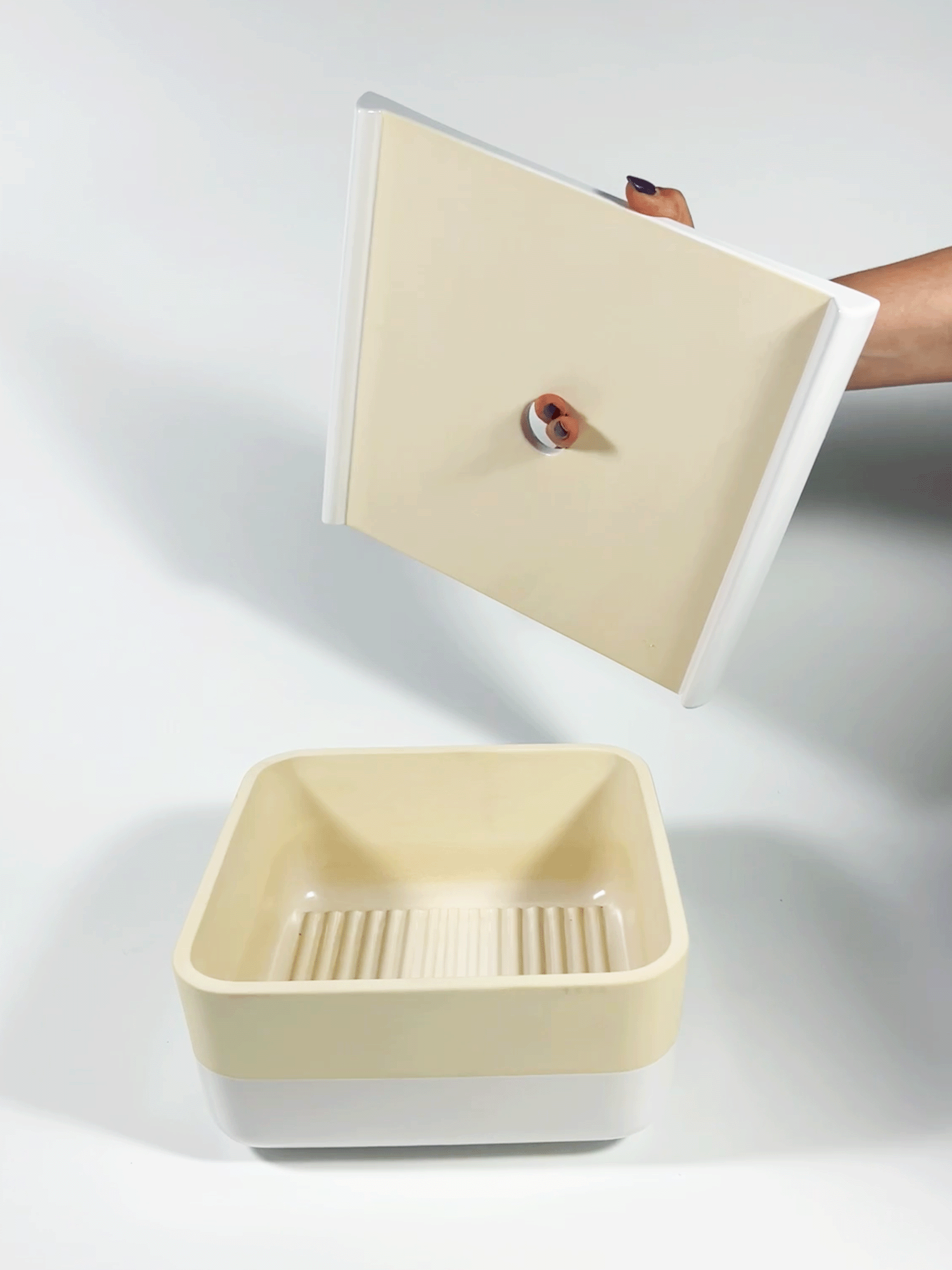 Im Frischekasten liegen die Lebensmittel auf einer gewellten glasierten Fläche, damit keine Druckstellen entstehen und die Luft gut zirkulieren kann. Der Deckel ist mit einem Loch ausgestattet, um ihn leichter anheben zu können. Er kann als Schneidefläche genutzt werden.