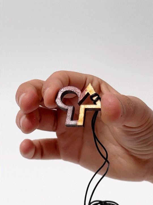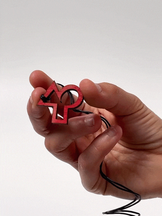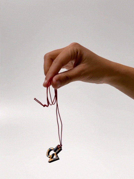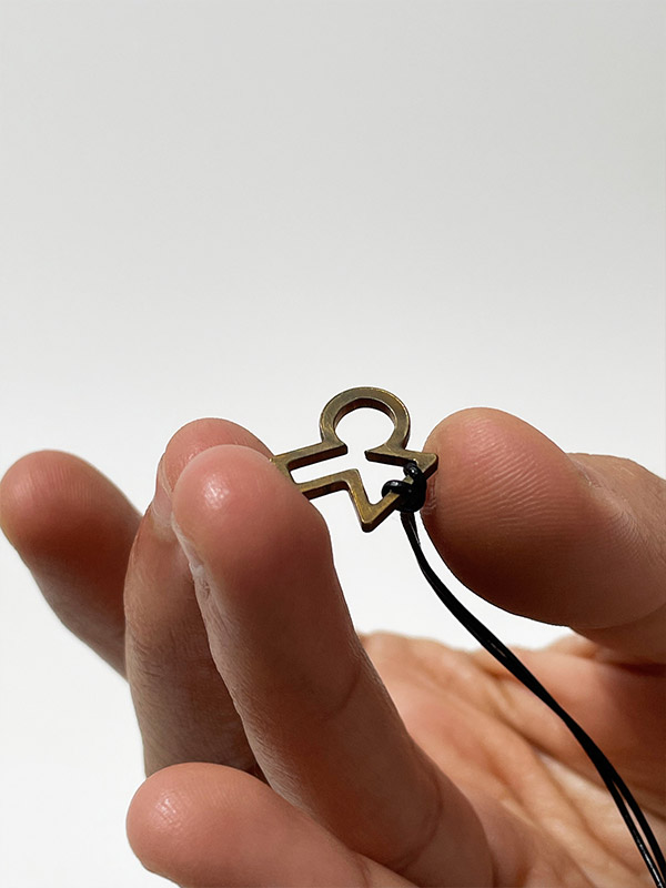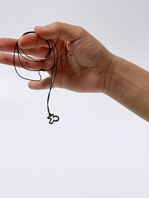 Mit dieser Kette werden Sie Teil des kollektiven Kunstwerkes Game Over Society. Personen, die die Kette besitzen und tragen stricken ein analoges Netzwerk – ganz ohne Akku, ohne Daten, ohne Web. Die Kette gibt es in zwei Varianten: eine kleine aus Messing und eine größere aus Holz.