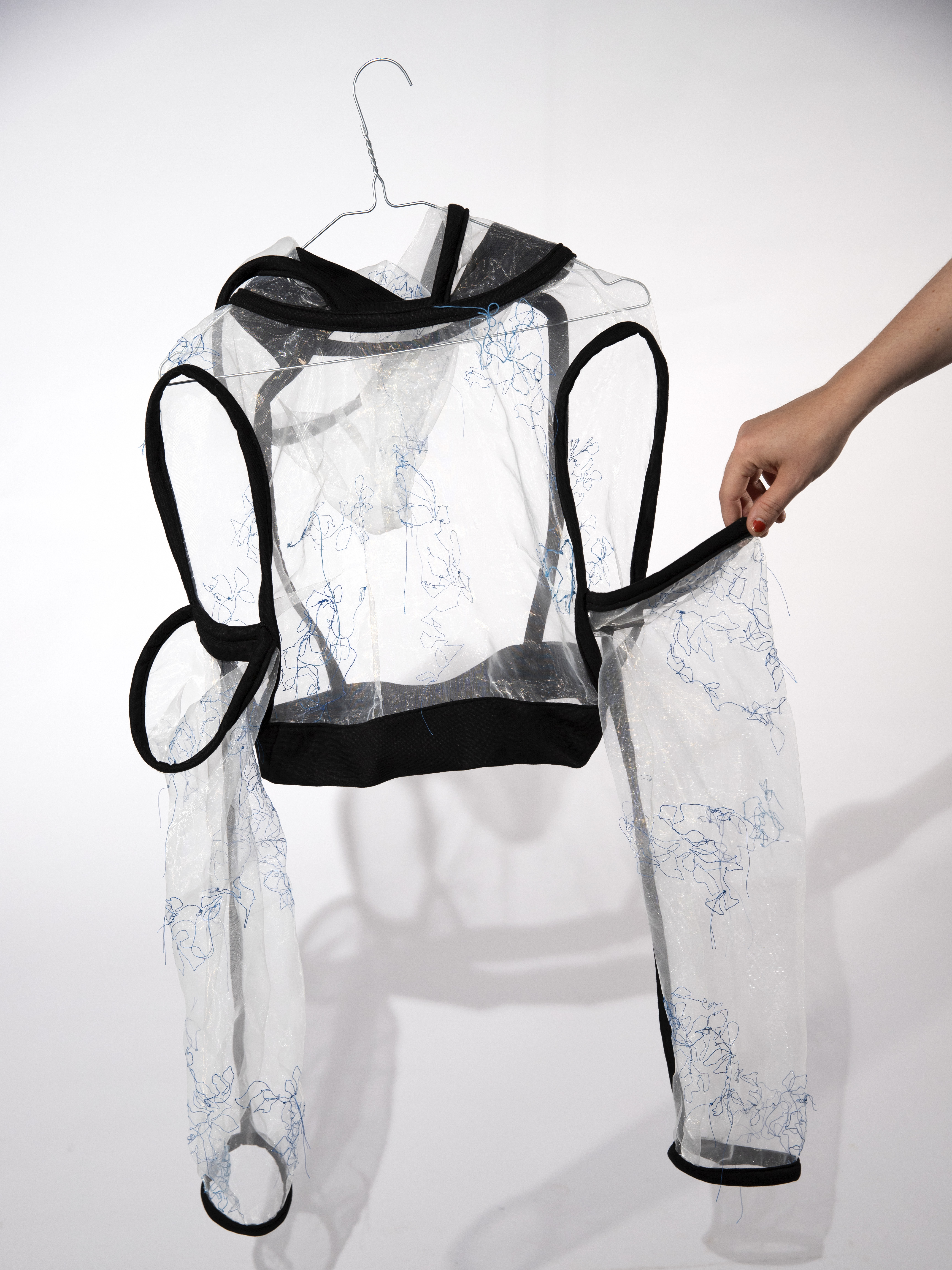 Lucille Gonzales verwendet für ihren Hoodie schlichte Oberflächen und kombiniert sie zu einem Statement-Piece, welches etwas sportlich jedoch gleichzeitig grazil und fein wirkt. Der Hoodie wurde aus einer gebrauchten Gardine und einem Sweatshirt, der zu Schrägband verarbeitet wurde gefertigt. Die Oberflächen sind mit teilweise recyceltem Garn aus gebrauchten Gardinen handbestickt.