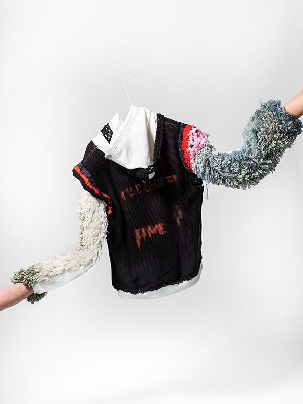 Der Hoodie SE EQUIVOCÓ LA PALOMA zeigt, wie aus Materialien aus dem Haushalt ein neues, tragbares Kleidungsstück entstehen kann. Im Upcyclingprozess wurden an den Ärmeln des Hoodies selbstgefärbten Baumwollmops montiert, zwei unabhängigen Schulterpolstern aus unterschiedlicher Wolle geschaffen und einem schwarzen Häkelnetz vorne in der Mitte angebracht, welches seinen Weg zur oberen Kapuze findet. Kombiniert wird der Hoodie mit einer schwarzen Feinstrick-Crop-Weste und einem Rückenteil, aus einem Feinstrick-Pullover. Auf dem Rücken findet sich in gebleichter Schrift der Text „ciao bellezza fine“.