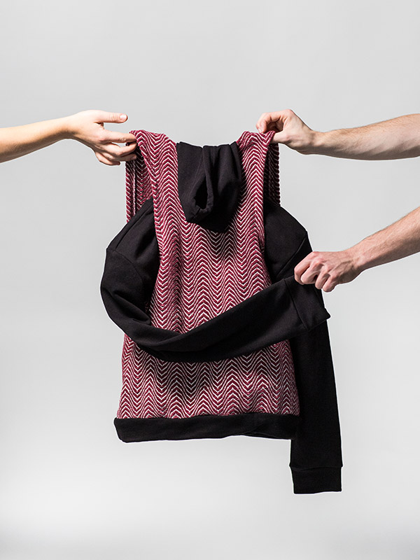 Weben ist in der aus der Türkei stammenden Familie von Sezgin Kivrim eine weit verbreitete und immer noch aktiv ausgeführte Technik, mit der sich die Designerin für diesen Hoodie beschäftigt hat. Fasziniert davon, dass man mit dieser Technik Textilien vollkommen selber erstellen und sogar Musterungen kontrollieren kann, entstand der Hoodie „The big w(e)ave“. Auch mit dem Wellenmuster webt die Designerin Sezgin Kivrim einen thematischen Bezug zu Ihrer Familie, die an der Küste lebt, in den Hoodie ein.