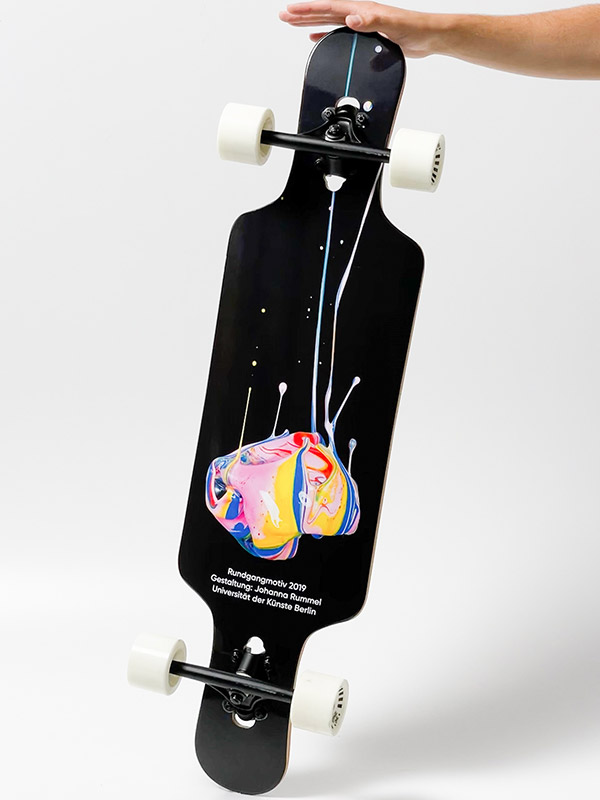 Die 2018 Edition des Rundgang Longboards mit dem Design von Johanna Rummel ist ein absolutes Unikat. Mit einer klassischen Form ist es gleichermaßen für Anfänger*innen und Fortgeschrittene geeignet. Bestehend aus acht Lagen kanadischem Ahorn, 180mm Achsen + 70mm, 82A Rollen für gute Wendigkeit, für ein Körpergewicht bis 100 kg.